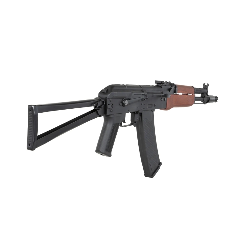 AEG puška Specna Arms AKS-74 zo série J-Series CORE™ Gen.2 v čiernom prevedení s plastovým predpažbím v imitácii dreva.