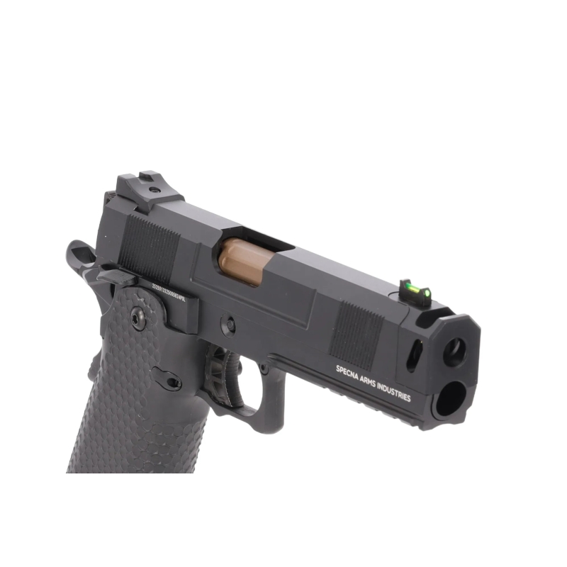 Hľadáte plynovú Hi-Capa pištoľ, ktorá spája pevný kovový záver, výborný výkon a priaznivú cenu? Chcete univerzálnu airsoftovú pištoľ, ktorá ponúka silný blowback, pohodlný úchop s hrubou textúrou a možnosť pripojenia svetla alebo laseru na RIS lištu pod hlavňou? Potrebujete kompletnú sadu so 2 zásobníkmi a náhradnou tryskou? Potom je Specna Arms SA-VGP17 VAPOR™ tou správnou voľbou. Pištoľ je navrhnutá tak, aby bola vhodná aj pre začiatočníkov, no svojím výkonom a kompatibilitou s TM Hi-Capa dielmi poteší aj skúsených hráčov. Poháňaná je plynom typu Green Gas, ktorý poskytuje stabilný výkon a realistický spätný ráz. Kovový čiastočne delený záver s kompenzátorom dodáva zbrani atraktívny vzhľad a ľahší chod záveru, zatiaľ čo Magwell uľahčuje rýchle prebíjanie. Obsahuje klasické bezpečnostné prvky TM Hi-Capa – pákovú poistku a dlaňovú poistku v rukoväti. Pod rámom sa nachádza RIS lišta na montáž svetla alebo laseru a vnútorný závit 11 mm CW pre tlmič alebo kompenzátor. Vďaka dobrému utesneniu, náhradným dielom a druhému zásobníku získate spoľahlivú pištoľ vhodnú do CQB aj na vonkajšie akcie.