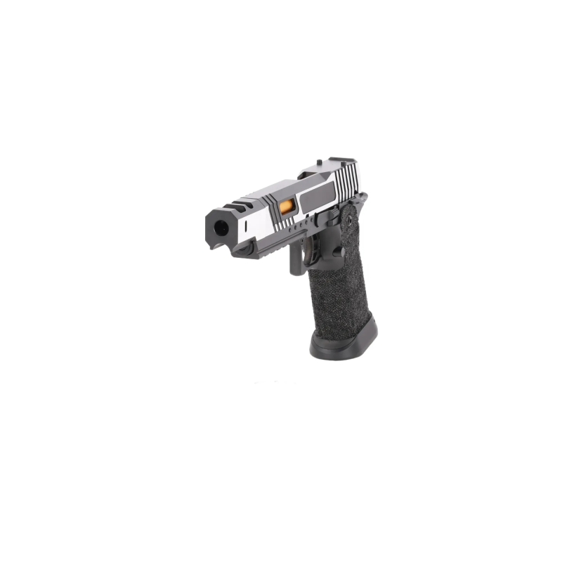 Hľadáte plynovú Hi-Capa pištoľ, ktorá spája pevný kovový záver, výborný výkon a priaznivú cenu? Chcete modernú airsoftovú pištoľ, ktorá ponúka silný blowback, istý úchop s hrubou textúrou a možnosť montáže kolimátora priamo na záver? Potrebujete kompletnú sadu so 2 zásobníkmi a náhradnou tryskou? Potom je Specna Arms SA-VGP20 VAPOR™ OR správnou voľbou. Pištoľ je univerzálna – vhodná pre začiatočníkov aj pokročilých hráčov, kompatibilná s dielmi TM Hi-Capa. Poháňaná je plynom typu Green Gas so stabilným výkonom a realistickým spätným rázom. Kovový čiastočne delený záver s masívnym kompenzátorom dodáva realistický vzhľad a agresívny dizajn. Optic-Ready výrez je určený pre kolimátory s RMR rozstupom (18,8 mm) – kompatibilný s Trijicon RMR / SRO, Holosun 507/508, Vector Optics Frenzy a ich replikami. O bezpečnosť sa stará dlaňová a páková poistka. Pod rámom sa nachádza RIS lišta pre svetlo alebo laser, zatiaľ čo vnútorný závit 11 mm CW umožňuje montáž tlmiča alebo kompenzátora. Spoľahlivé utesnenie, dva zásobníky a náhradné diely robia z tejto pištole spoľahlivú voľbu pre CQB aj vonkajšie hry.