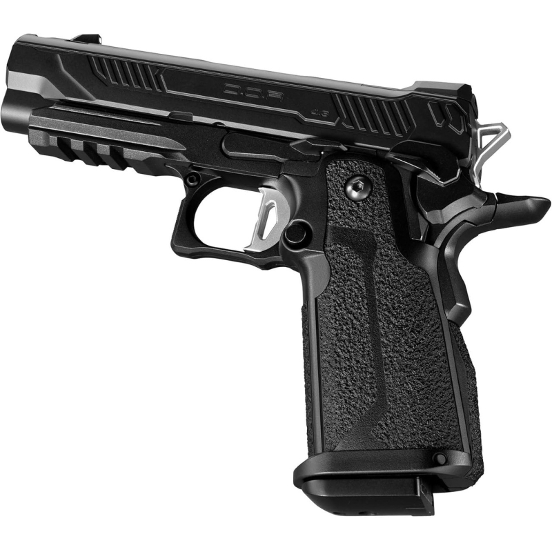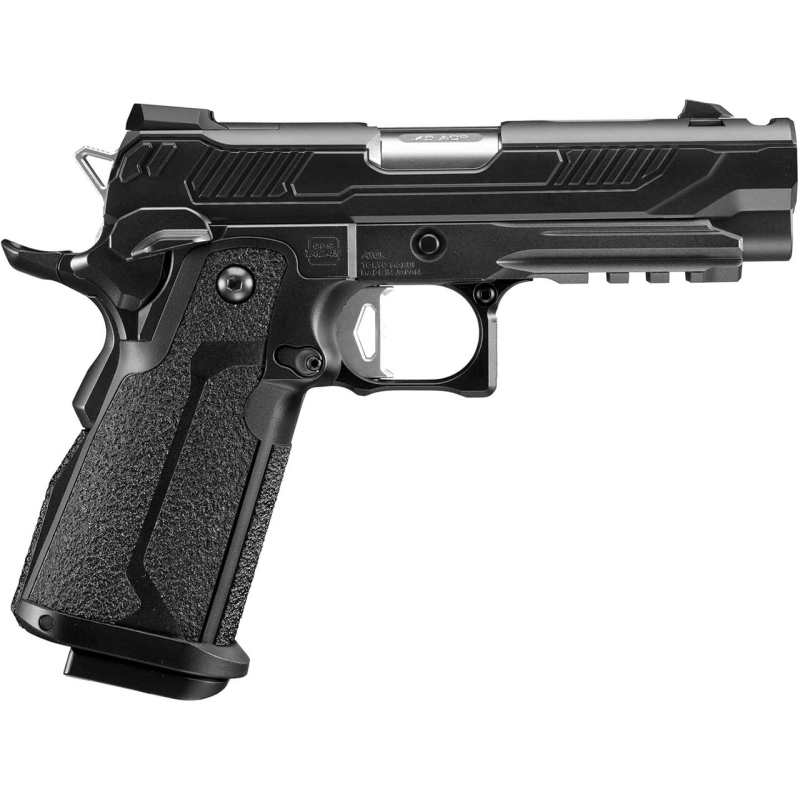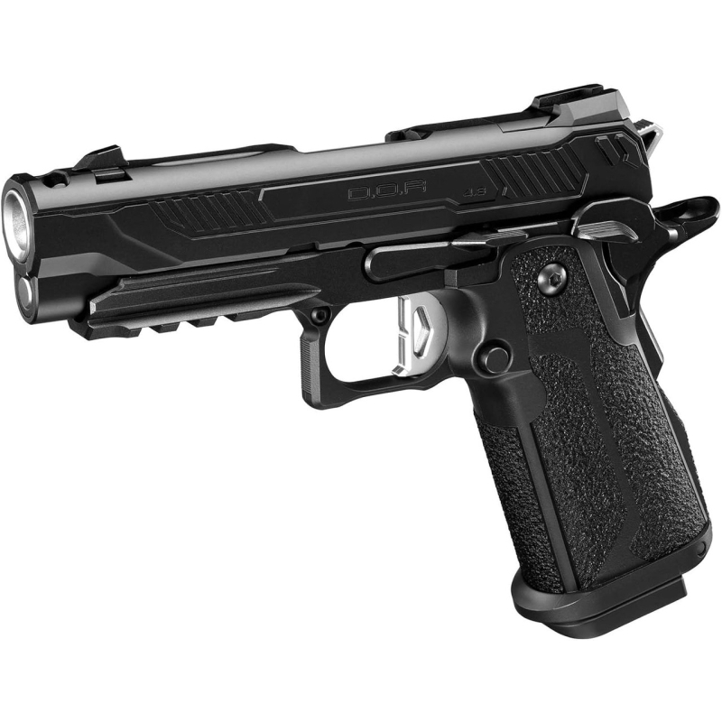 Model D.O.R (Direct Optics Ready) umožňuje priamu inštaláciu voliteľného kolimátora Micro Pro Sight po demontáži zadného mieridla. Súčasťou balenia je nízka aj zvýšená montážna základňa, pričom vysoká verzia obsahuje záložné mechanické mieridlá použiteľné po zložení kolimátora zo zbrane. Novo tvarovaný 4,3" záver s prednými drážkami a zvýšenými rebrami zlepšuje manipuláciu aj pri použití optiky. Krátka plochá spúšť (Flat trigger) a predĺžený záchyt záveru prispievajú k lepšej manipulácii so zbraňou. Dynamický plynový blowback (GBB) ponúka výrazný spätný ráz a realistický chod záveru vrátane zastavenia pri prázdnom zásobníku. Overený vnútorný mechanizmus TM Hi-Capa zabezpečuje stabilný cyklus, spoľahlivý výkon a veľké množstvo dostupných upgrade dielov. Kovová výstuha v oblasti záchytu záveru znižuje opotrebenie a predlžuje životnosť záveru bez obmedzenia iba na Light Gas alebo nutnosti investovať do kovového záveru. Pištoľ má teda polymérový protišmykový rám aj záver, preto nie je vhodná pre silné plyny ako Red Gas, avšak najnovšia generácia plynových zbraní Tokyo Marui už zvláda štandardný Green Gas, s ktorým ponúka solídny výkon až 90 m/s. Pri teplejšom počasí nad 20 °C však odporúčame používať Light Gas pre dlhšiu životnosť vnútorných dielov.