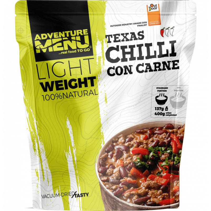 Adventure Menu | Lightweight hotové jedlo Chilli con Carne (400 g po príprave) ponúka minimum hmotnosti pri zachovaní maximálnej chuti vďaka šetrnému sušeniu mrazom Vacuum-Dried / Tasty. Jedlo je uvarené zo 100% prírodných surovín a na prípravu stačí iba horúca voda (MRE – Meal-Ready-to-Eat). ANAREUS ponúka rôzne príchute vrátane mäsových aj vegánskych variantov.