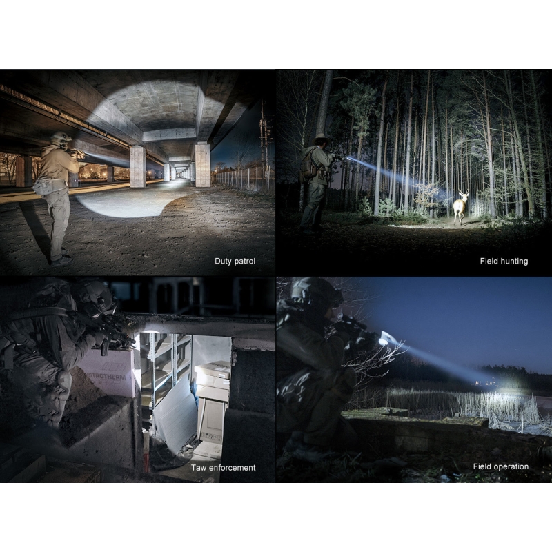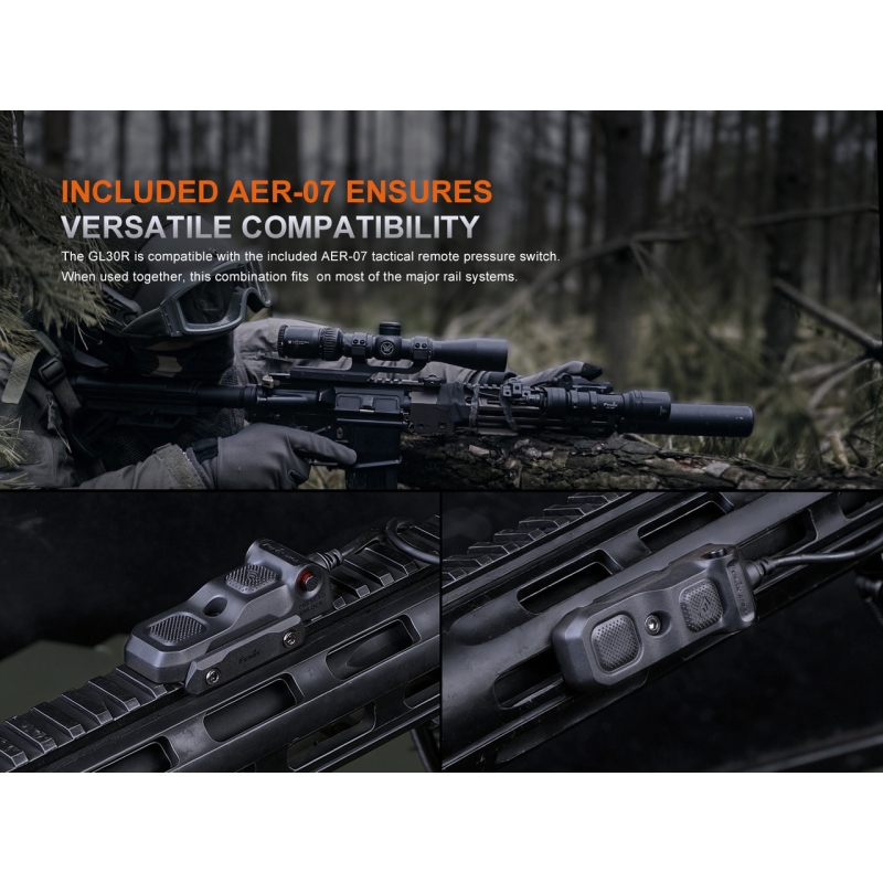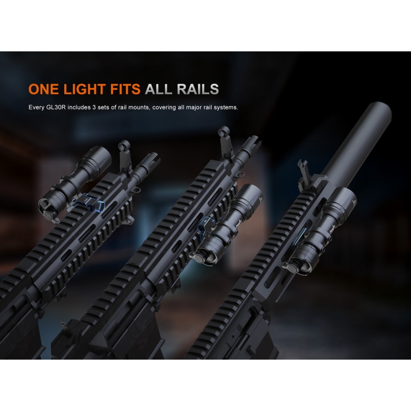 Fenix GL30R je svietidlo navrhnuté pre montáž na dlhé zbrane a ponúka kombináciu vysokého výkonu, odolnosti a jednoduchého ovládania. Svetelný tok 800 ANSI lumenov v kombinácii s úzko zaostreným kužeľom dosahuje dosvit až 630 metrov. Svietidlo využíva Li-ion akumulátor 18650 (3400 mAh) s možnosťou nabíjania cez USB-C, prípadne je možné použiť aj 2× CR123A batérie. Ovládanie je možné zadným spínačom alebo diaľkovým spínačom AER-07 s poistkou proti nechcenému zapnutiu. Vďaka priloženým montážam ju jednoducho upevníte na RIS lištu alebo M-LOK slot v priamej aj offset pozícii. Robustné telo z hliníkovej zliatiny zvládne náročné podmienky v teréne aj na strelnici.