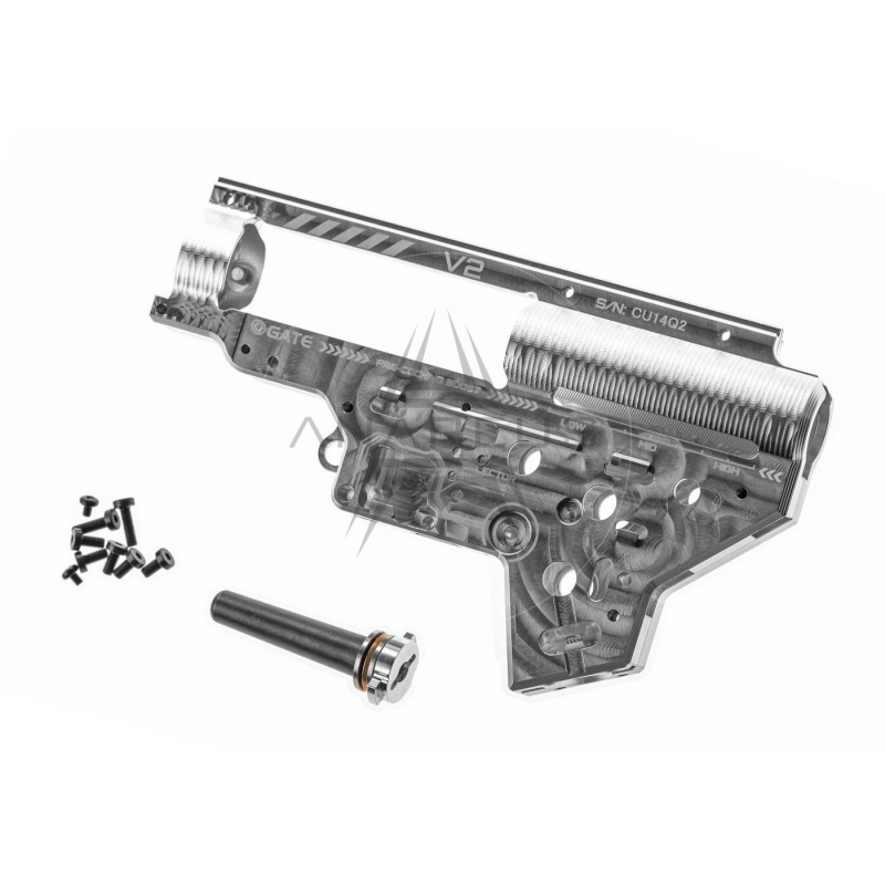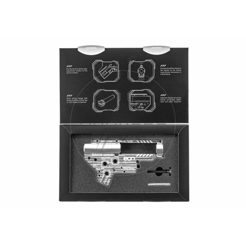 CNC mechabox EON od GATE je výsledkom špičkového inžinierstva. Je celý vyrobený z leteckého hliníka 7075 T6 a ponúka extrémnu odolnosť a dlhú životnosť pre akýkoľvek upgrade. Pri použití s ETU jednotkami GATE TITAN alebo ASTER navyše získate doživotnú záruku. Skelet je frézovaný na presných CNC strojoch a obsahuje kontrolné okienka na nastavenie AOE, prednataženia a prítlaku motora. Vďaka tomu ľahko doladíte vnútro bez potreby opakovaného rozoberania. Mechabox umožňuje rýchlu výmenu pružiny (QSC) a je kompatibilný s ESA-2. Inštalácia je možná do väčšiny bežných M4 / AR15 tiel, vrátane VFC zbraní s duálnym prepínačom.