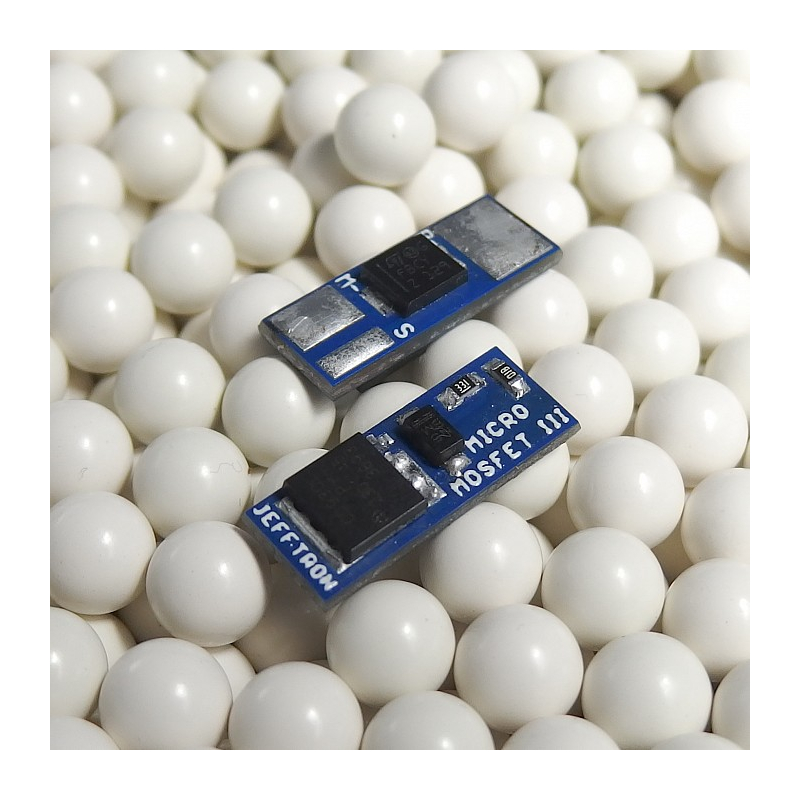 Mikro MOSFET je profesionálne navrhnutý minimalistický elektronický spínač bez aktívneho brzdenia, ktorý nahrádza klasické mechanické prepínanie prúdu cez kontakty spúšte. Tým eliminuje opalovanie kontaktov a zároveň zvyšuje účinnosť elektrického obvodu zbrane. Zariadenie umožňuje dosiahnuť vyššiu kadenciu a dlhšiu výdrž batérie v porovnaní s bežným zapojením. Ide o kompaktný modul, vhodný najmä pre skúsených technikov a servisy, keďže inštalácia vyžaduje pokročilé znalosti AEG zbraní.