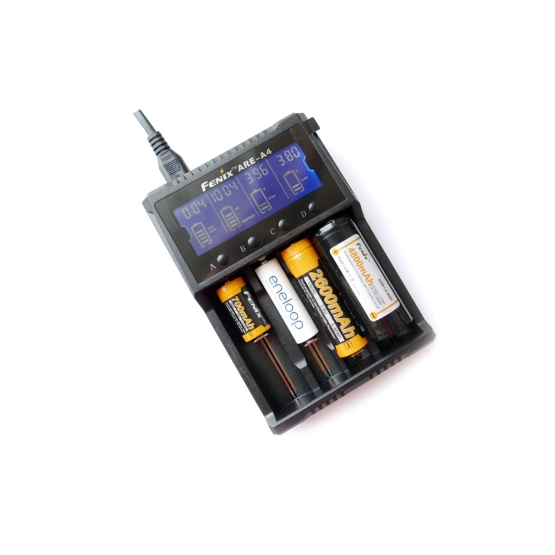 Fenix ARE-A4 je univerzálna 4-kanálová USB nabíjačka určená pre Li-ion aj NiMH/NiCd akumulátory. Každý slot funguje nezávisle, takže môžete súčasne nabíjať batérie rôznych typov, kapacít a veľkostí. Nabíjačka automaticky rozpozná typ vloženej batérie a prispôsobí optimálny nabíjací algoritmus CC/CV. Displej zobrazuje napätie, nabíjací prúd, čas nabíjania a typ batérie. Je ideálna na domáce použitie aj pre náročných používateľov, ktorí pracujú s viacerými batériami. Vďaka širokej kompatibilite zvládne aj väčšie články ako 26650 alebo C (v dvoch pozíciách) alebo až štyri menšie batérie naraz. Nabíjačka je chránená proti skratu, prepólovaniu a umožňuje vypnutie/zapnutie displeja podľa potreby.