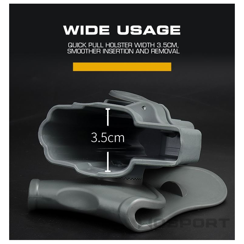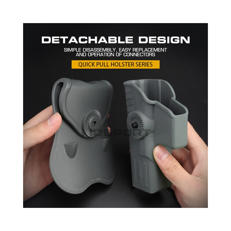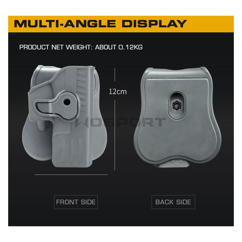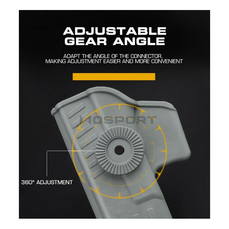 Púzdro je navrhnuté s dôrazom na bezpečnosť pri nosení zbrane a rýchle tasenie. Jeho jedinečný dizajn obsahuje integrovanú bezpečnostnú poistku, ktorá udrží vašu pištoľ pevne v púzdre aj pri behu. Zároveň je vybavené nastaviteľným skrutkovým mechanizmom, ktorý umožňuje prispôsobiť sklon tasenia pištole podľa potreby.