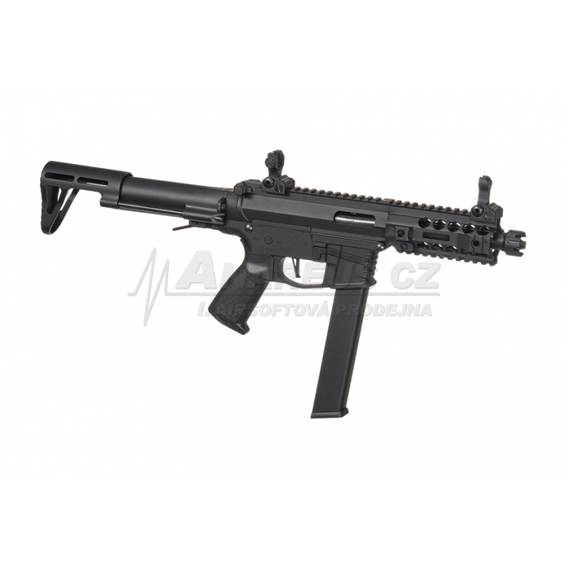 Telo zbrane vrátane výsuvnej pažby je vyrobené z odolného polymeru s nádhernou povrchovou úpravou, táto malá bestia je skutočne odolná a pevná, zároveň extrémne ľahká a manévrovateľná. Predurčená k ovládnutiu CQB arén. Ovládanie je intuitívne vďaka overenej platforme AR-15. Na ľavej strane nájdete presný prepínač streľby, oboustrannú natahovaciu páku a na pravej strane výhadzovacie okienko nábojov, ktoré vám umožní jednoduchý prístup k nastaveniu hop-upu. Ten je síce plastový, ale je precízne spracovaný a ľahko nastaviteľný pomocou rotačného prstena.