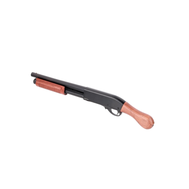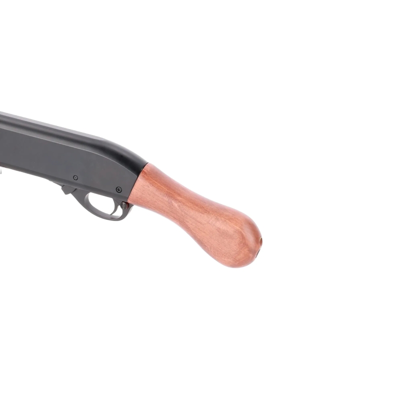 Hľadáte kompaktnú a ľahkú pump-action brokovnicu s pravým dreveným pažbením pre CQB? Chcete používať realistické patróny s kapacitou 30 BBs? Potrebujete spoľahlivý plynový pohon a možnosť nastaviť režim 3 alebo 6 BBs na výstrel? Potom je Specna Arms SA-VGS14 VAPOR™ presne to, čo hľadáte. Je navrhnutá ako univerzálna CQB brokovnica, ktorá spája kovové časti s odolnými polymérovými doplnkami. Pohon zabezpečuje Green Gas (integrovaný zásobník v rukoväti), čo zaručuje spoľahlivý výkon a stabilný tlak. Zosilnená tryska poskytuje konzistentné dávkovanie plynu a prepínač streľby pod otvorom pre patróny umožňuje voľbu medzi 3 alebo 6 BBs na výstrel. O bezpečnosť sa stará mechanická poistka a tlačidlové uzamknutie zásobníka. Brokovnica VAPOR™ je určená pre rýchlu manipuláciu v CQB, jednoduché prebíjanie a spoľahlivý výkon. Model SA-VGS14 ponúka krátku hlaveň s dreveným predpažbím a rukoväť typu birdshead pre streľbu od pása. Táto verzia nemá pažbu, takže je ideálna ako kompaktná záložná alebo breacher brokovnica.