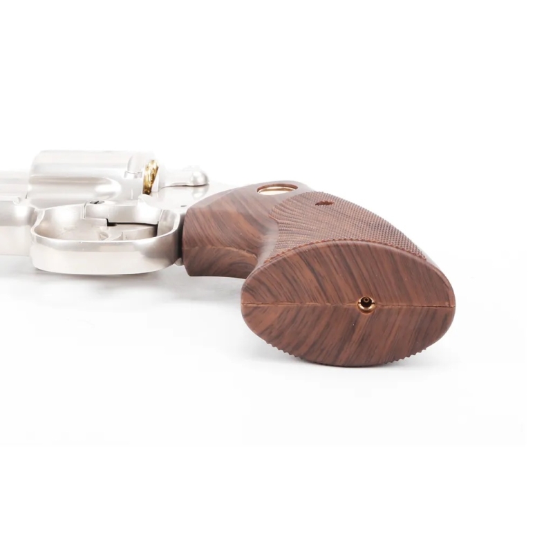 Rukoväť s drevenou textúrou a zlatým logom zabezpečuje pohodlný úchop. Kovový bubienok umožňuje rýchle nabíjanie aj vybíjanie nábojníc vďaka rýchlonabíjaču a vystreľovaciemu piestiku. Predné aj zadné mieridlá zaručujú jednoduché mierenie a bezpečnostná poistka chráni pred nechceným výstrelom.