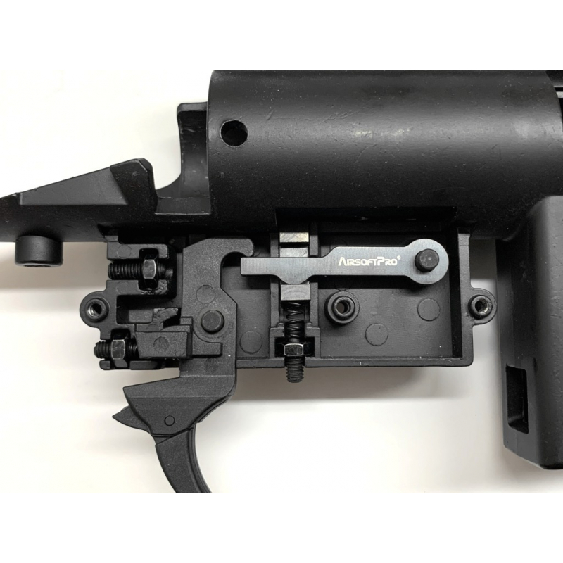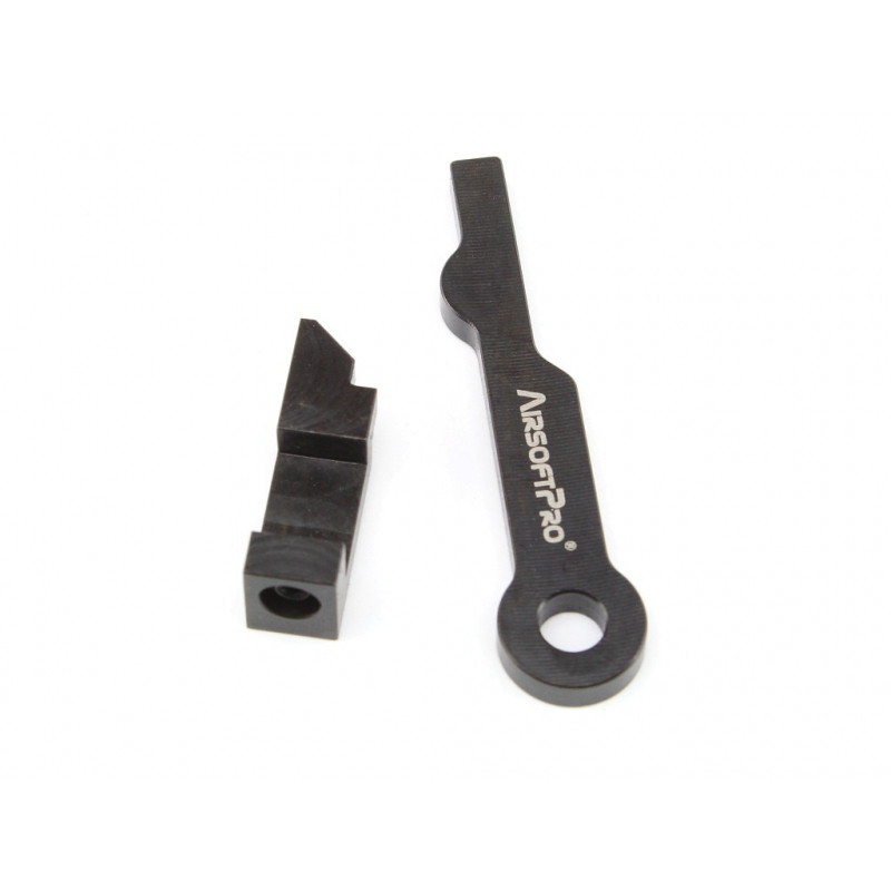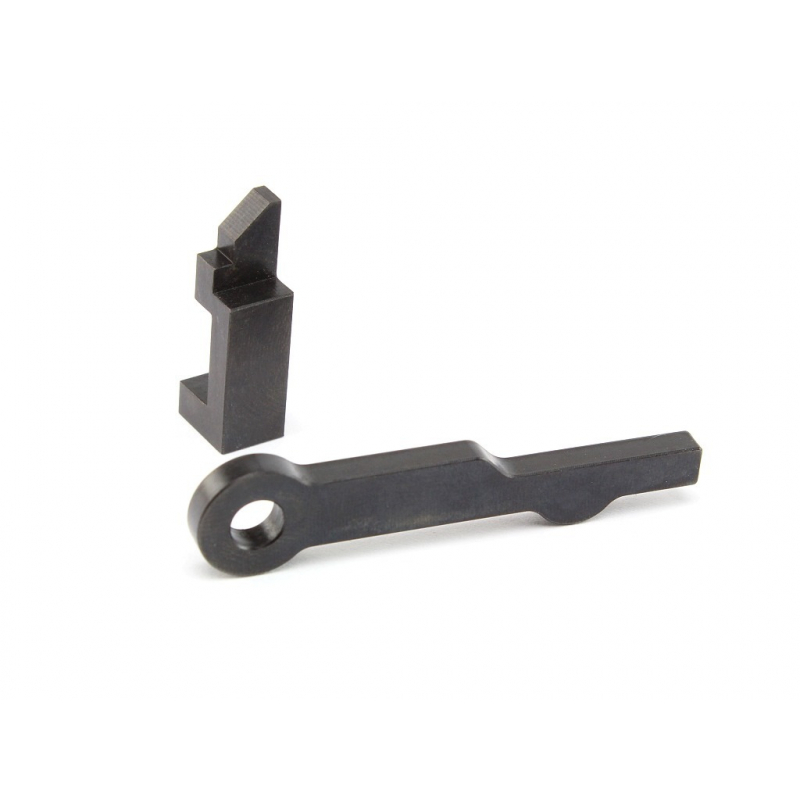 Upgrade díly pro spoušťový mechanismus manuální odstřelovací pušky Ares Amoeba Striker AS-02. Balení obsahuje páku a záchyt pístu. Oba díly jsou ocelové a kalené HRC48-55°. Záchyt má ve své dolní části regulační šroub. S jeho pomocí lze nastavovat chod spouště.