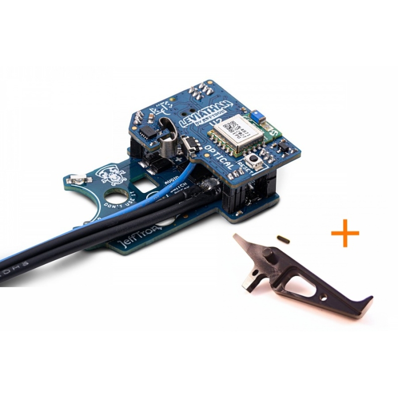 Leviathan V2 Optical je elektronická ETU jednotka s Bluetooth, určená na inštaláciu do mechaboxu V2 a V2.5 podľa TM štandardu. Vďaka optickým senzorom pre detekciu výstrelu a prepínača režimu streľby a extrémne krátkemu spínaču (iba 0,13 mm) umožňuje nastavenie realistického hair trigger módu. Systém Real Feel Trigger System (RFTS) so pružinou simuluje odpor reálnej spúšte a poskytuje reset po výstrele. Cez mobilnú aplikáciu JeffTron môžete v reálnom čase nastavovať režimy streľby, kadenciu, aktívnu brzdu, prednatiahnutie piestu, virtuálny zásobník a množstvo ďalších funkcií. Vstupný aj výstupný port podporuje pripojenie externých doplnkov ako svietidlá, elektrické zásobníky alebo senzor prázdneho zásobníka. Jednotka je chránená konformným lakom. Je kompatibilná s vysokokadečnými zostavami vrátane DSG kolies a je plne pripravená na Brushless motory ako Warhead. Všetky zmeny v aplikácii sa okamžite ukladajú do pamäte jednotky. K jednotke navyše dostanete aj CNC hliníkovú spúšť od Retro Arms s nastavovacím skrutkou a štýlovým dizajnom.