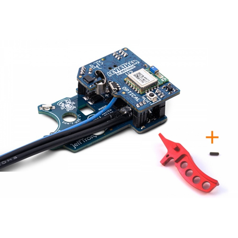 Leviathan V2 Optical je elektronická ETU jednotka s Bluetooth, určená na inštaláciu do mechaboxu V2 a V2.5 podľa TM štandardu. Vďaka optickým senzorom pre detekciu výstrelu a prepínača režimu streľby a extrémne krátkemu spínaču (iba 0,13 mm) umožňuje nastavenie realistického hair trigger módu. Systém Real Feel Trigger System (RFTS) so pružinou simuluje odpor reálnej spúšte a poskytuje reset po výstrele. Cez mobilnú aplikáciu JeffTron môžete v reálnom čase nastavovať režimy streľby, kadenciu, aktívnu brzdu, prednatiahnutie piestu, virtuálny zásobník a množstvo ďalších funkcií. Vstupný aj výstupný port podporuje pripojenie externých doplnkov ako svietidlá, elektrické zásobníky alebo senzor prázdneho zásobníka. Jednotka je chránená konformným lakom. Je kompatibilná s vysokokadečnými zostavami vrátane DSG kolies a je plne pripravená na Brushless motory ako Warhead. Všetky zmeny v aplikácii sa okamžite ukladajú do pamäte jednotky. K jednotke navyše dostanete aj CNC hliníkovú spúšť od Retro Arms s nastavovacím skrutkou a štýlovým dizajnom.