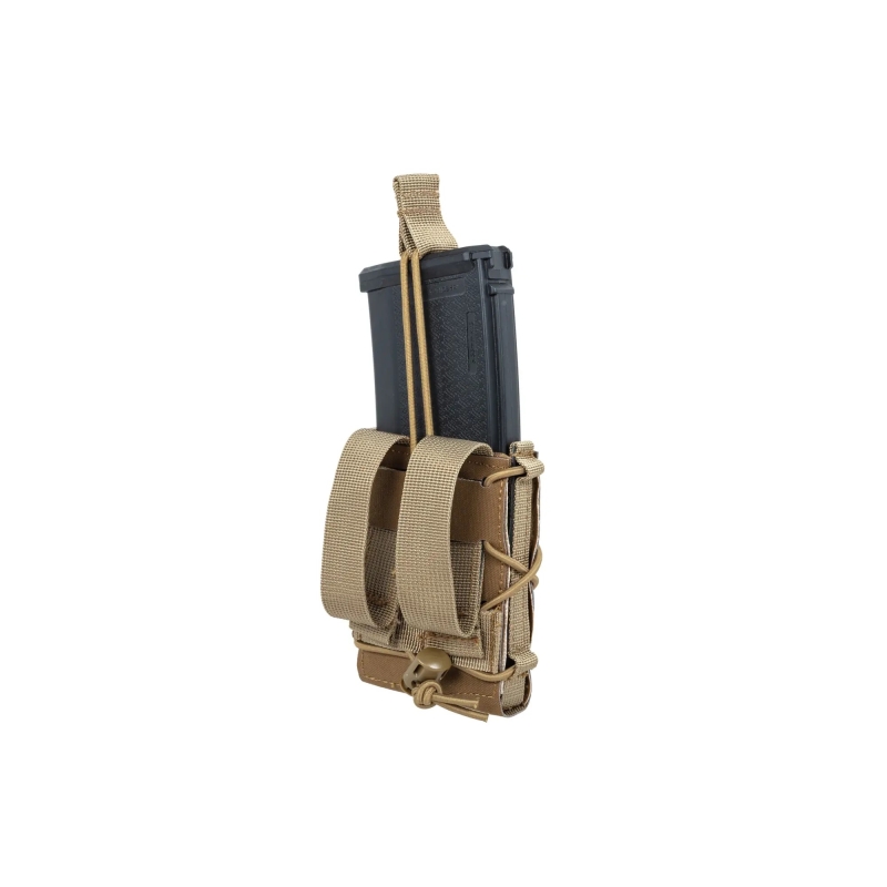 Hľadáte spoľahlivú a univerzálnu MOLLE sumku pre M4 alebo AK zásobníky? Potrebujete, aby zásobníky držali v sumke pevne a zároveň boli rýchlo dostupné? Táto elastická sumka od SATAC je presne to, čo hľadáte. Sumka na puškový zásobník AR15 (STANAG aj PMAG) alebo AK pojme jeden zásobník kalibru 5.56 až 7.62 a je kompatibilná aj s airsoftovými zásobníkmi. Vďaka dizajnu s Laser-cut MOLLE väzbou ju môžete vrstviť na ďalšie sumky, čo je ideálne pre efektívne usporiadanie výstroja. Nastaviteľné gumové lanko po bokoch zabezpečuje pevný svor zásobníka. Sumka je vyrobená z odolného materiálu CORUND 500D, takže bez problémov zvládne aj drsné podmienky v teréne.