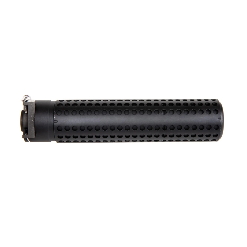 5KU SR16 QD je airsoftový tlmič navrhnutý pre hráčov, ktorí chcú rýchlo meniť konfiguráciu svojej pušky bez použitia náradia. Vďaka rýchloupínaciemu QD systému ho nasadíte na priložený tlmič výšľahu v priebehu sekúnd a rovnako rýchlo ho aj zložíte. Hliníkové telo pôsobí pevne a realisticky a zároveň zbytočne nezaťažuje prednú časť zbrane. Rozmery 170 × 38 mm zodpovedajú moderným karabínam typu M4, MK18, HK416 a ďalším replikám kalibru 5.56. Tlmič sme testovali na zbraniach Specna Arms PRIME™, kde pasoval bez problémov. Pri použití na HPA zbraniach vnútorná molitanová vložka čiastočne tlmí typický hluk výstrelu. Pri AEG zbraniach má tlmič čisto dekoračnú funkciu (dummy tlmič), pretože hluk AEG vzniká už v gearboxe, nie na konci hlavne. Ak chcete celkovo stíšiť AEG pušku, odporúčame inštalovať sorbo pad, presne vypodložkovať kolesá a nastaviť AoE (uhol záberu piestu na ozubené koleso).