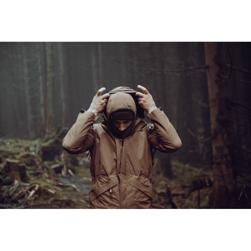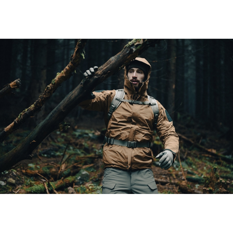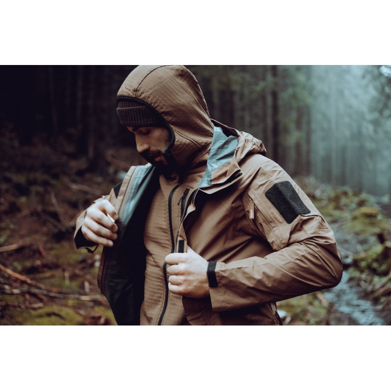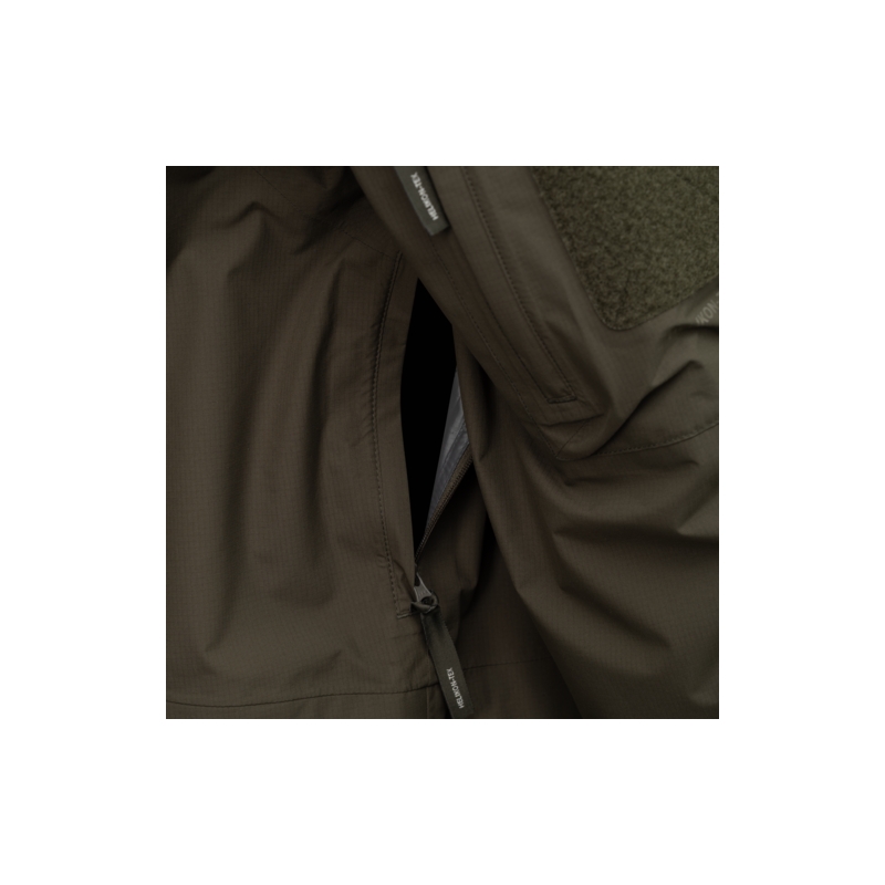 Bunda využíva 2.5-vrstvovú polyuretánovú membránu, ktorá blokuje dážď a vietor zvonka a zároveň umožňuje únik vlhkosti od tela. Hodnota vodného stĺpca 20 000 mm poskytuje spoľahlivú ochranu aj počas silného dažďa a vetra. Priedušnosť 20 000 g/m²/24 h znamená nízky odpor pri odparovaní potu, čo oceníte pri pohybe v teréne, na strelnici alebo pri aktívnej službe. Lepené švy a kvalitný YKK® obojsmerný zips spolu so zapínaním Prym zabezpečujú tesnosť bez obmedzenia plynulosti chodu zipsu. Povrch je ošetrený DWR úpravou bez PFC, ktorá odpudzuje vodu a nečistoty a spomaľuje nasiaknutie materiálu.