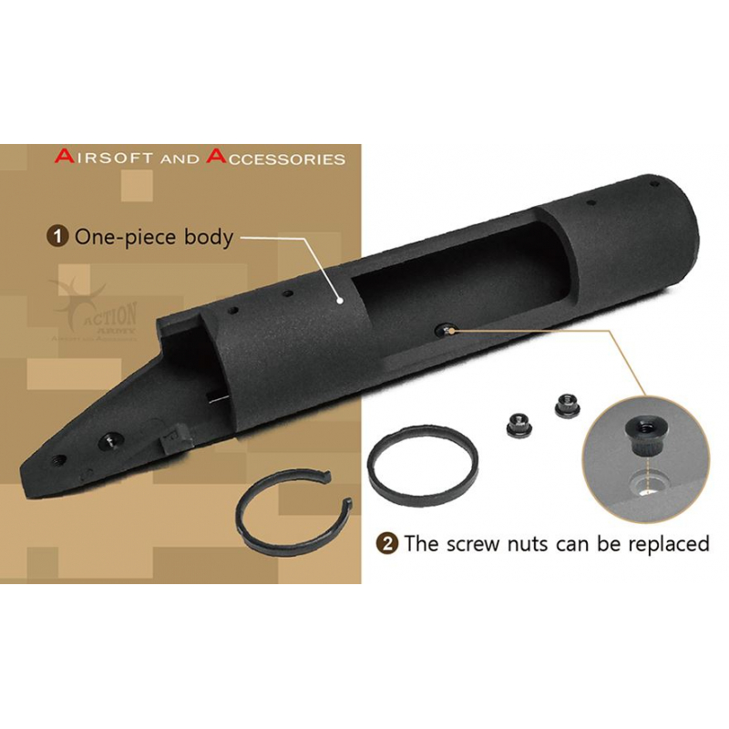CNC hliníková montážna lišta VSR-10 na puškohľad od Action Army v prevedení čierna. Kompatibilná s Tokyo Marui VSR-10, Action Army T10 a replikami ako Well MB03. Odľahčený a zvýšený horný RIS rail s dostatkom miesta aj pre veľké puškohľady. Vyrobená z CNC obrábaného hliníka. Skrutky sú súčasťou balenia.