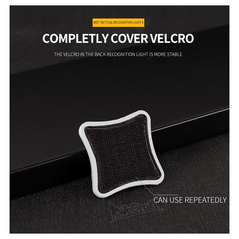 Na zadnej strane je suchý zips (velcro) pre pripevnenie na vybavenie alebo na prilbu.