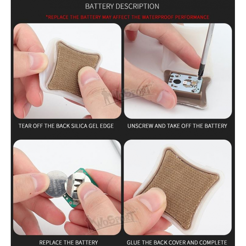 Zdroj svetla obstará batéria CR2032, ktorá je vymeniteľná a je súčasťou balenia (nesprávna inštalácia pri výmene batérie môže ovplyvniť vodotesnosť).